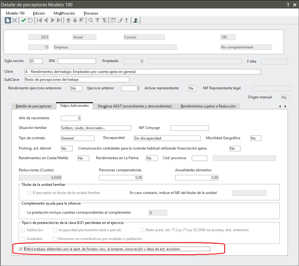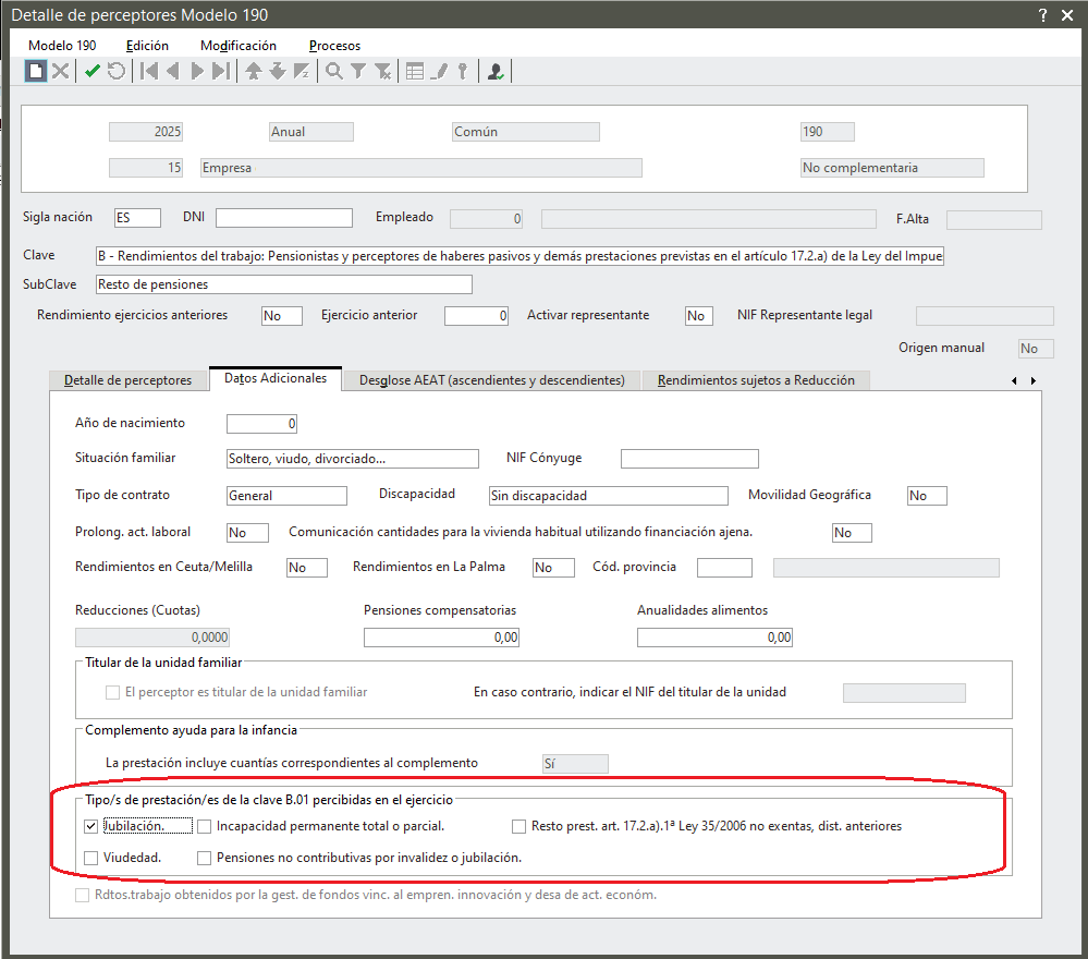 Para informarlo, se ha añadido la nueva agrupación “Tipo/s de prestación/es de la clave B.01 percibidas en el ejercicio” en el apartado Datos adicionales del Desglose de perceptores, sólo habilitado para dicha subclave.