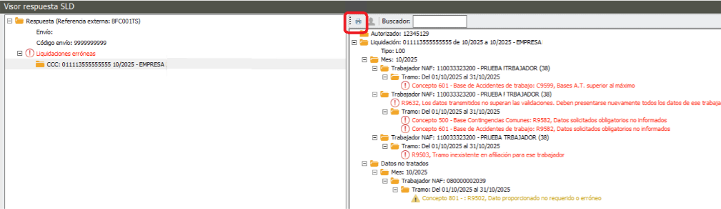 A través del nuevo botón Imprimir, podrás generar un listado en Excel con los códigos y descripciones asociadas a los errores de liquidación, trabajador o datos no tratados.
