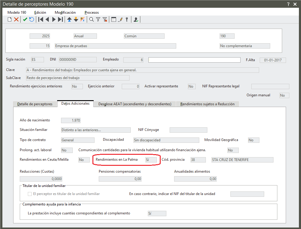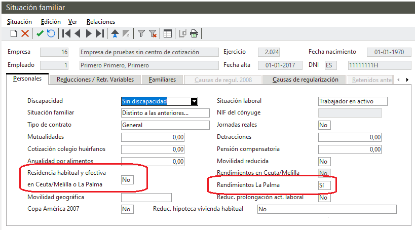 Recordemos que, previamente, para indicar que los perceptores de rentas y rendimientos sometidos a retención o ingreso a cuenta del Impuesto sobre la Renta de las Personas Físicas, con residencia habitual y efectiva en la Isla de La Palma, aplican la deducción prevista en el número 1.º del apartado 4 del artículo 68 de la Ley 35/2006, se debe informar el indicador Rendimientos en la Palma de la pestaña Personales del apartado Situación familiar de la ficha del trabajador.