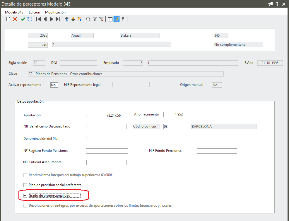 Se crea el campo Grado de Proporcionalidad, que deberá rellenarse cuando las aportaciones propias del empresario o empresaria individual o profesional a sistemas de previsión social guarden un grado de proporcionalidad con las contribuciones que estos o estas realizan a favor de los y las trabajadoras a su cargo.