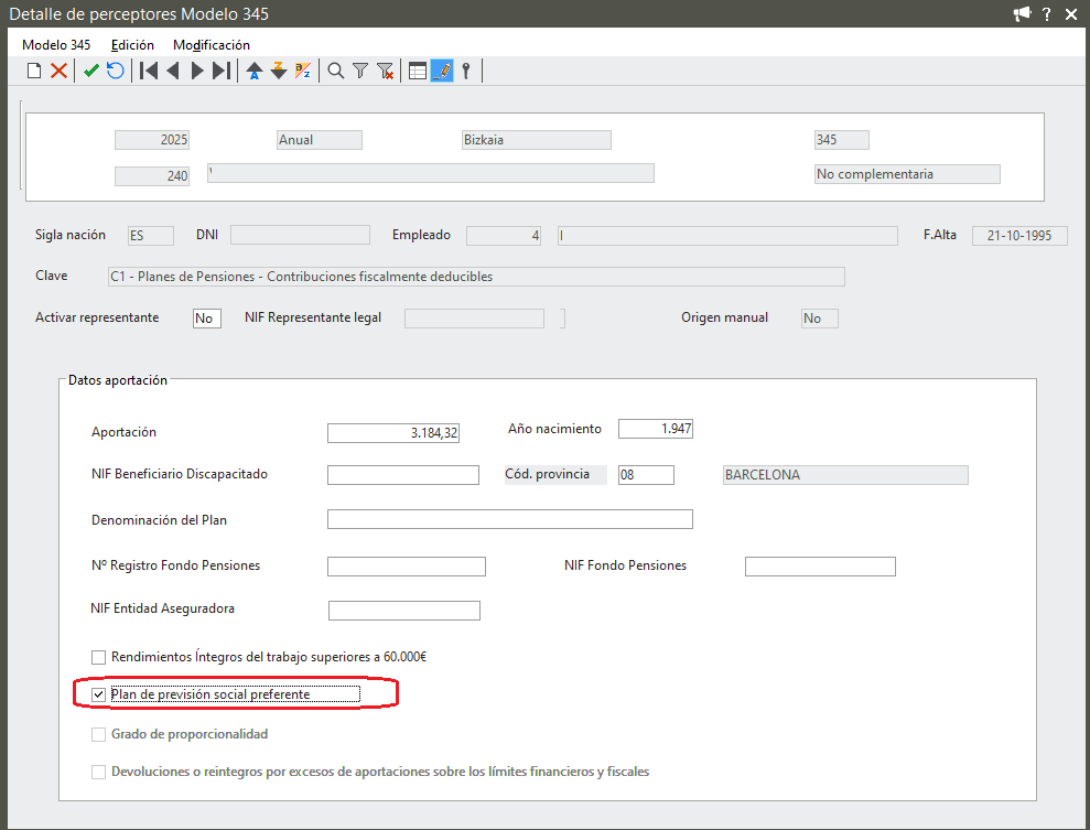 Se crea el campo Plan de Previsión Social Preferente, que deberá cumplimentarse cuando la aportación o la contribución empresarial se realice a un Plan de Previsión Preferente integrado en una Entidad de Previsión Social Voluntaria o un sistema de previsión de empleo distinto al anterior, incluidos los creados al amparo de la legislación de otros Estados miembros de la Unión Europea o del Espacio Económico Europeo, que cumpla los requisitos legales aplicables.
