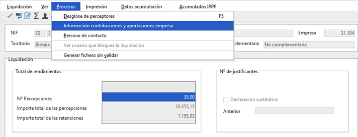 Tal y como se explica anteriormente, para poder informarlos, se ha incluido la nueva opción Información contribuciones y aportaciones empresa en el menú Prepara mi liquidación - Procesos.