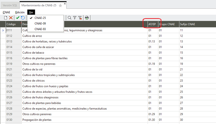 Se actualiza el mantenimiento CNAE para incluir en el campo AT/EP de esta tabla, la relación de los códigos CNAE AT/EP con CNAE-25