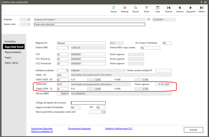 Nuevos campos CNAE 2025 en Empresa y Centros de Cotización: