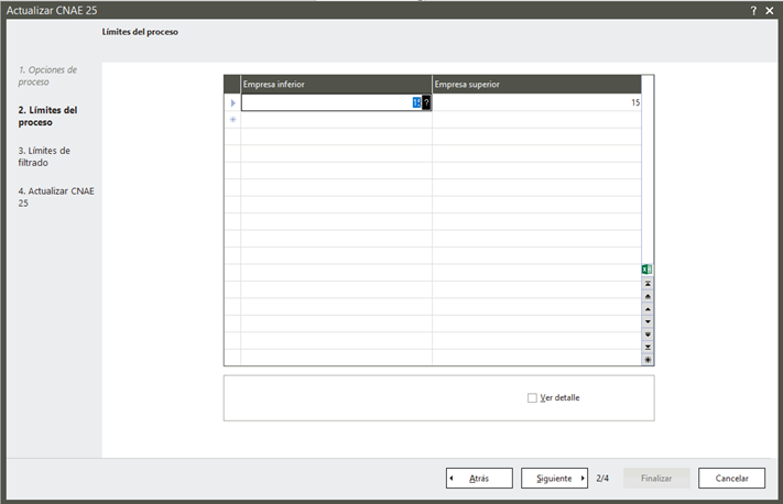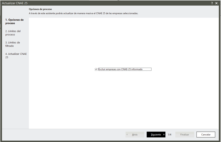 Si alguna de ellas ya tiene informado el CNAE 25, en la primera pantalla podrás excluirlas automáticamente activando la opción “Excluir empresas con CNAE 25 informado”.