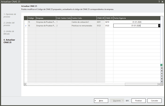 El asistente permite actualizar el CNAE 2025 de una o varias empresas en el mismo proceso.