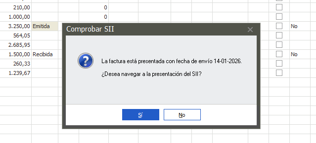 Al utilizar esta opción, el sistema verifica automáticamente si la factura está presentada en el SII y muestra el resultado mediante un aviso informativo, según el estado de la factura.