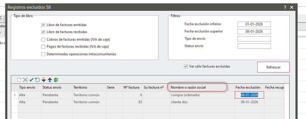 Hasta ahora, desde la pantalla de exclusión del SII no era posible identificar de forma directa a qué cliente o proveedor correspondía una factura excluida.